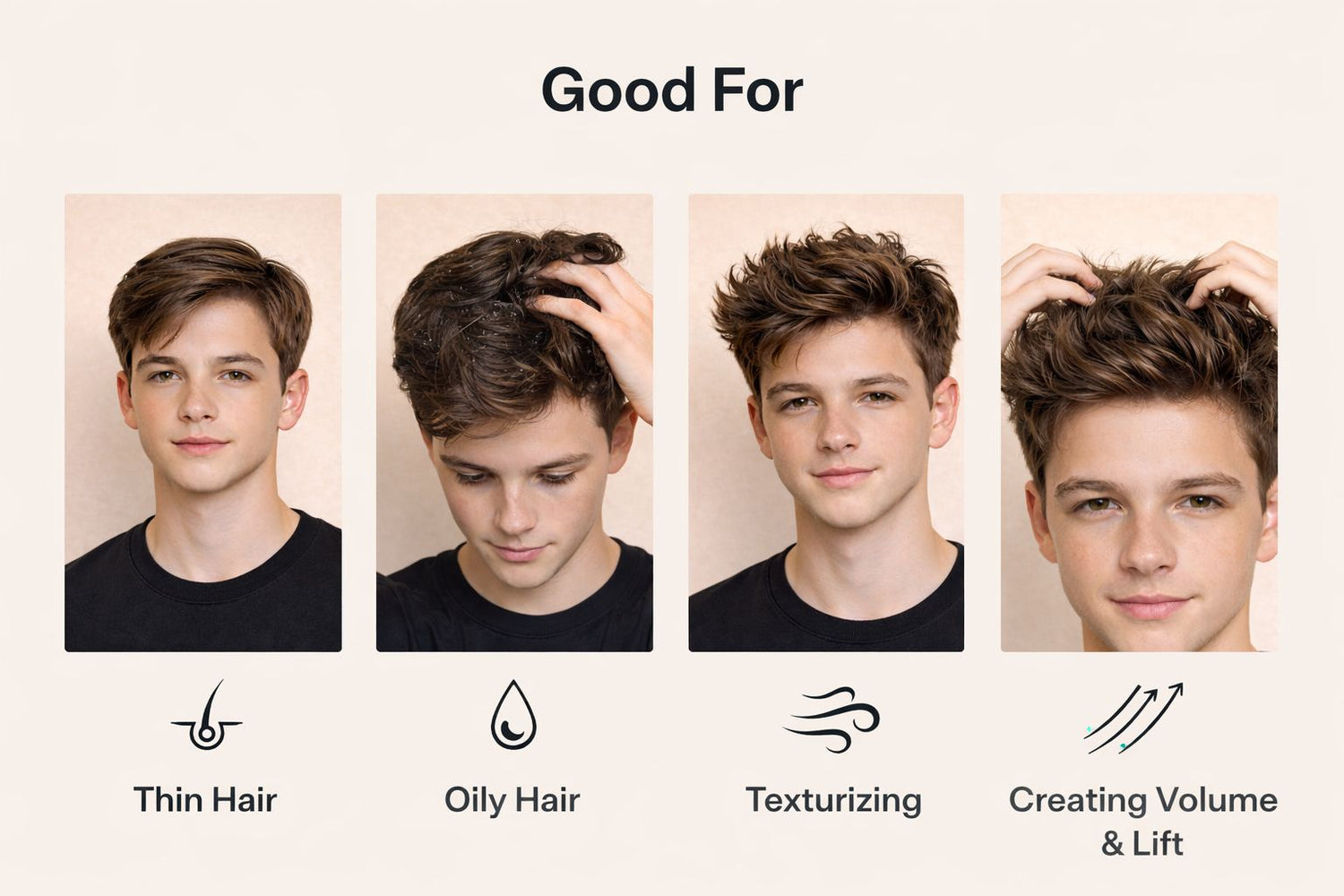 Designed for men who want instant volume, natural texture, and a clean matte finish without heaviness or shine. Ideal for all hair types, especially fine to medium hair, and for anyone looking to add lift and structure with a modern, understated look.